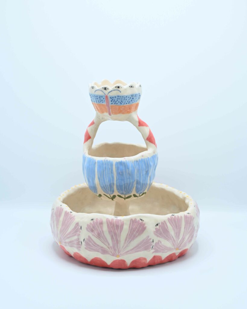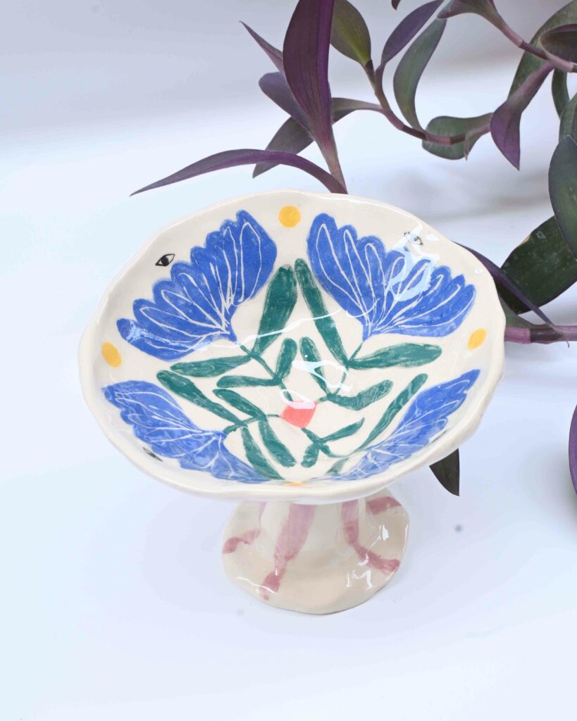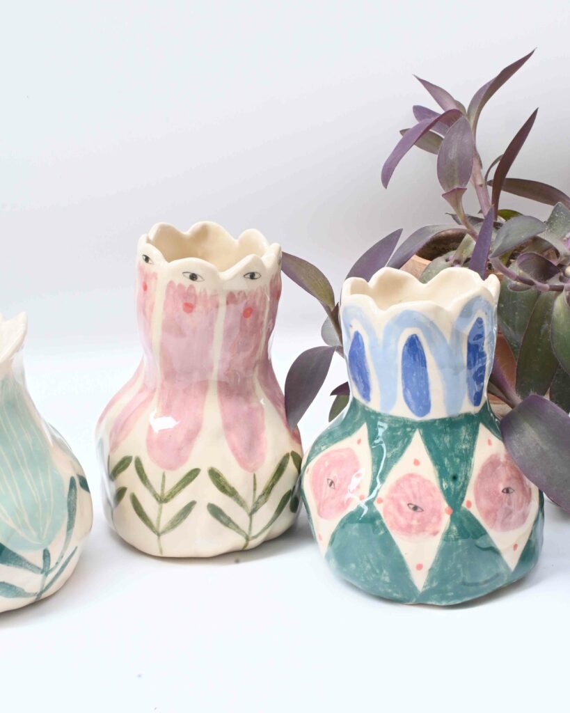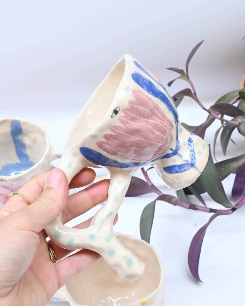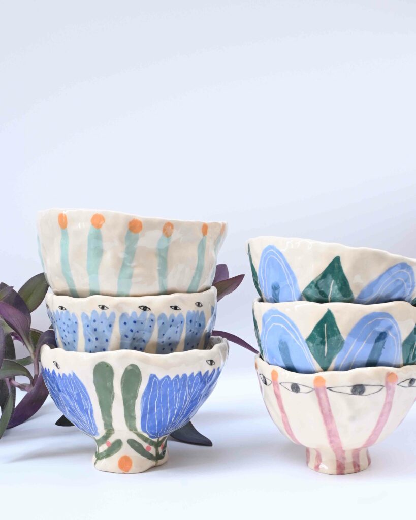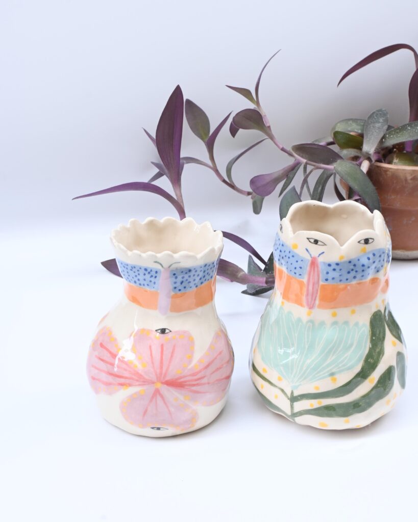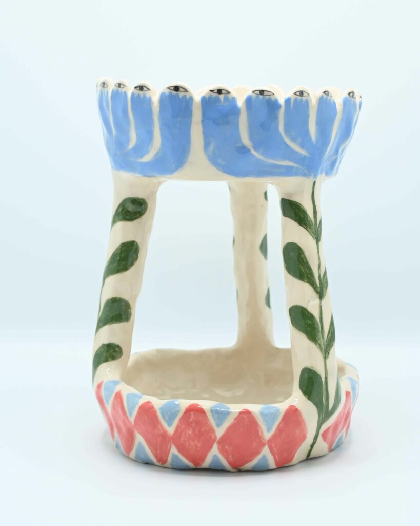 Je suis céramiste à Lyon. Je travaille la faïence au modelage, essentiellement au pincé. Je crée des pièces uniques ou des très petites séries. J’aime avoir un répertoire formelle assez irrégulier, dansant, organique, atypique. Je fabrique de la céramique utilitaire (assiettes, tasses grande anse, gobelet, cache-pot, coupe, vase) mais également des objet plus ornementaux ou décoratifs (médaillons, gris-gris, talismans)
